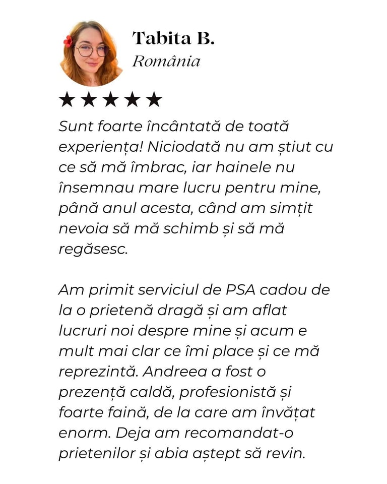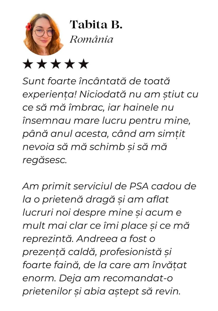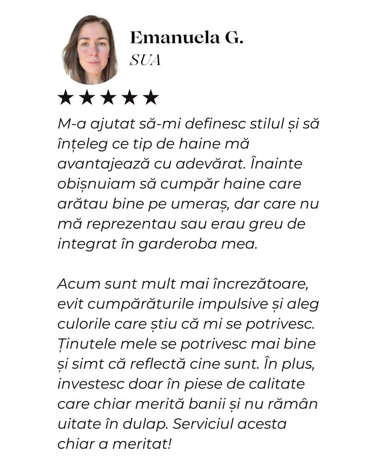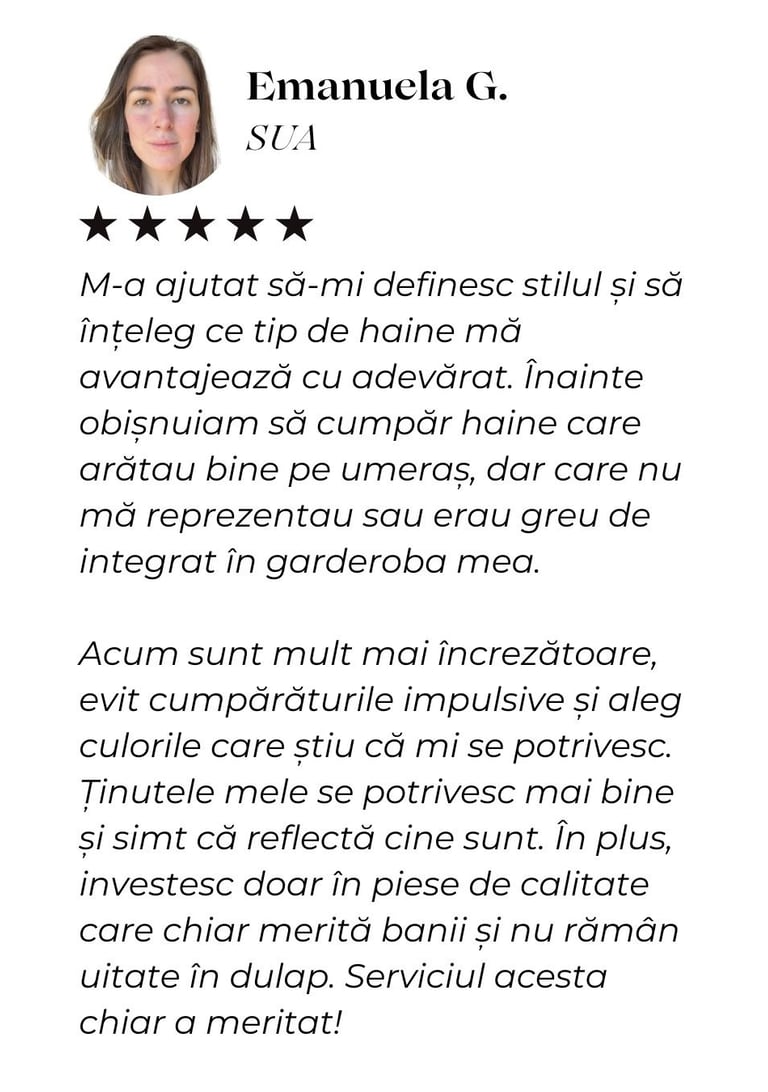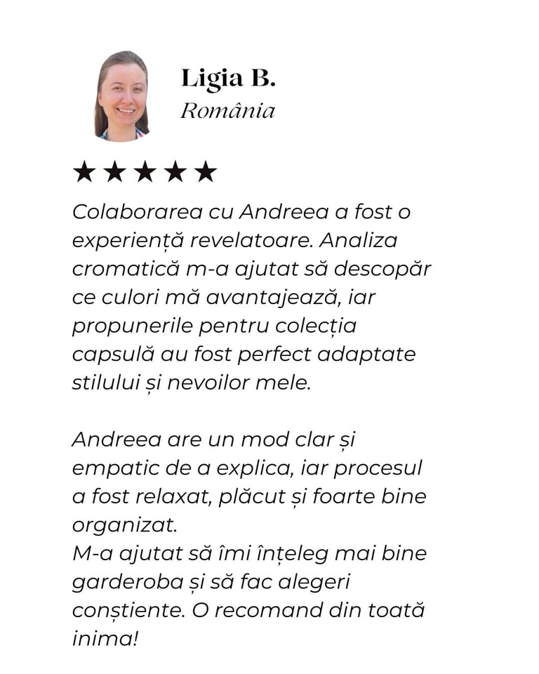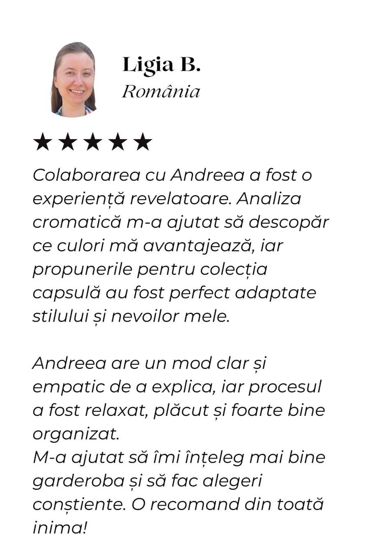 Am învățat cum să îmi pun în valoare calitățile și să ascund micile imperfecțiuni, iar acum simt că ținutele mele mă reprezintă cu adevărat. Recomand cu drag colaborarea cu ea oricui își dorește să arate și să se simtă mai bine în pielea sa.