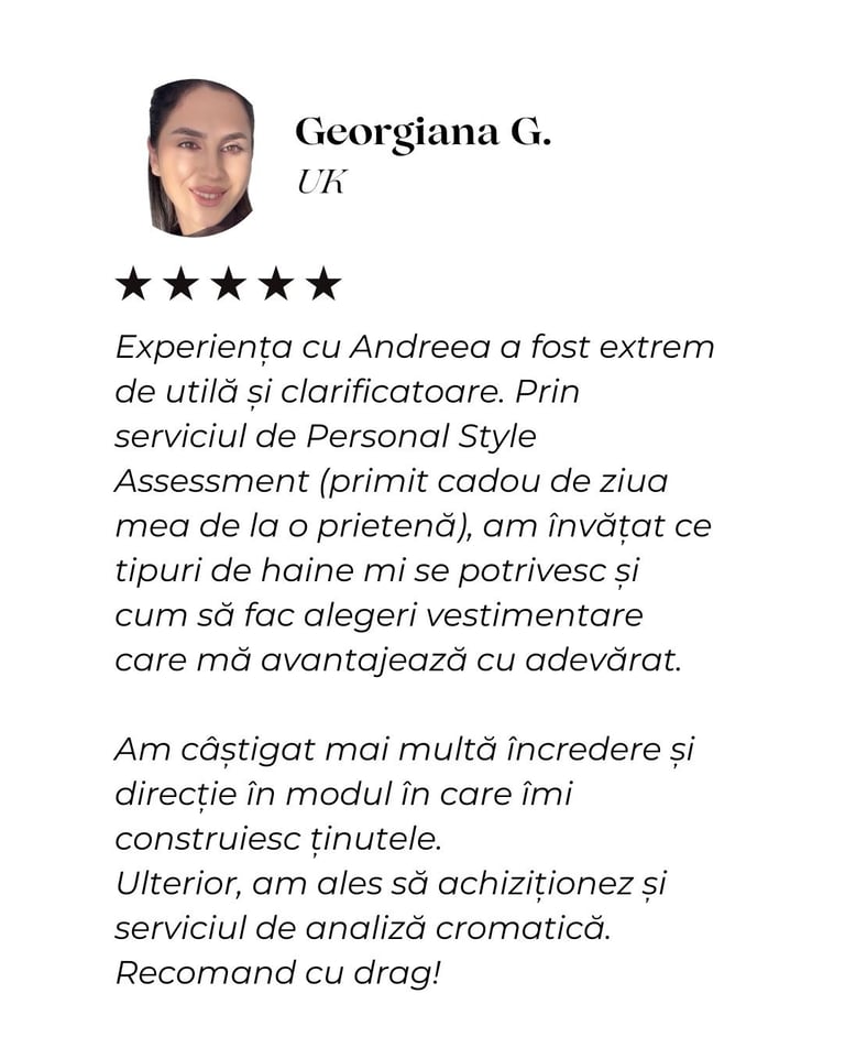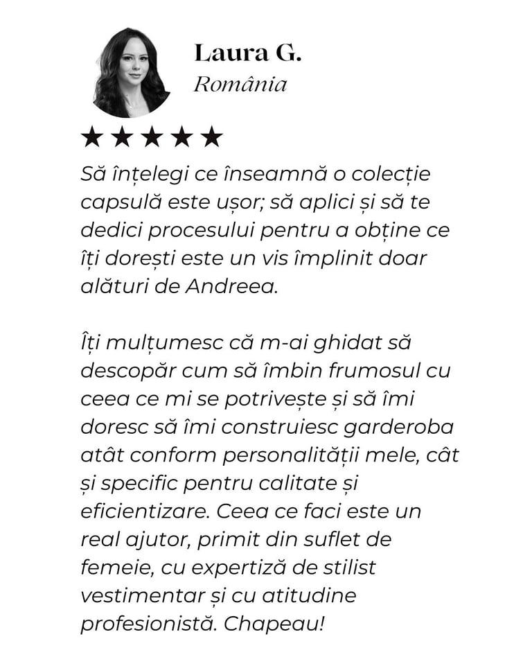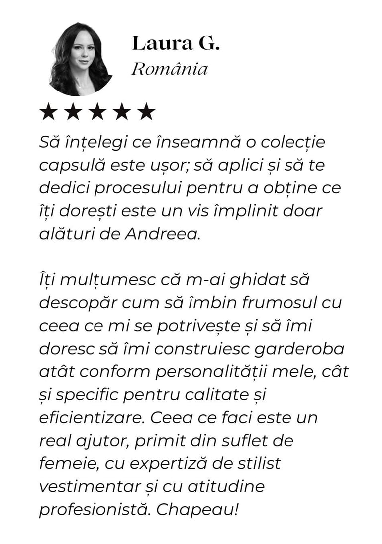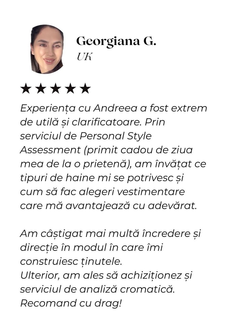Andreea m-a ajutat să îmi redescopăr stilul și să privesc altfel felul în care mă îmbrac. Cu multă răbdare și profesionalism, mi-a confirmat ce mi se potrivește, dar și ce nu mă avantajează, lucru care m-a ajutat enorm să capăt încredere în mine.