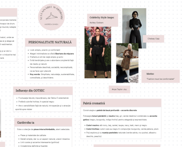 Un document elegant și clar, creat special pentru tine, care sintetizează concluziile evaluării într-un ghid aplicabil. Devine busola ta stilistică — un reper vizual și emoțional pentru garderoba ta viitoare.