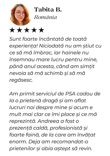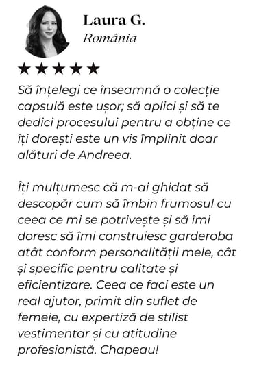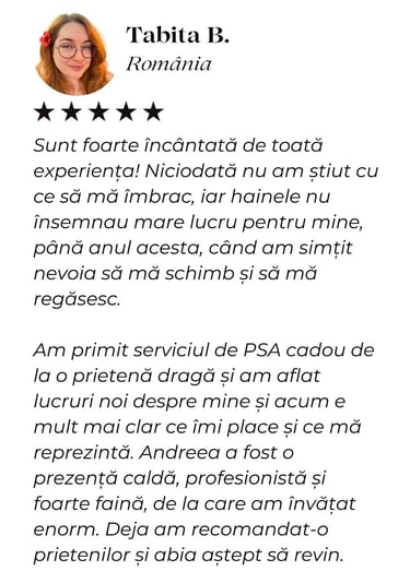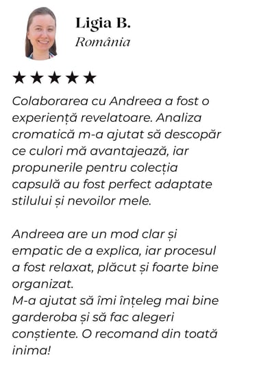 Andreea m-a ajutat să îmi redescopăr stilul și să privesc altfel felul în care mă îmbrac. Cu multă răbdare și profesionalism, mi-a confirmat ce mi se potrivește, dar și ce nu mă avantajează, lucru care m-a ajutat enorm să capăt încredere în mine.
