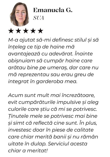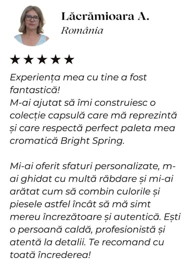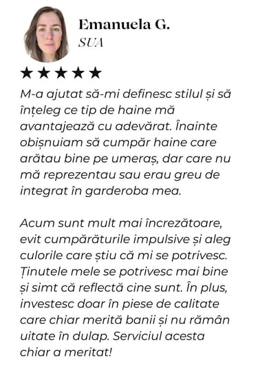 Mi-ai oferit sfaturi personalizate, m-ai ghidat cu multă răbdare și mi-ai arătat cum să combin culorile și piesele astfel încât să mă simt mereu încrezătoare și autentică. Ești o persoană caldă, profesionistă și atentă la detalii. Te recomand cu toată încrederea!